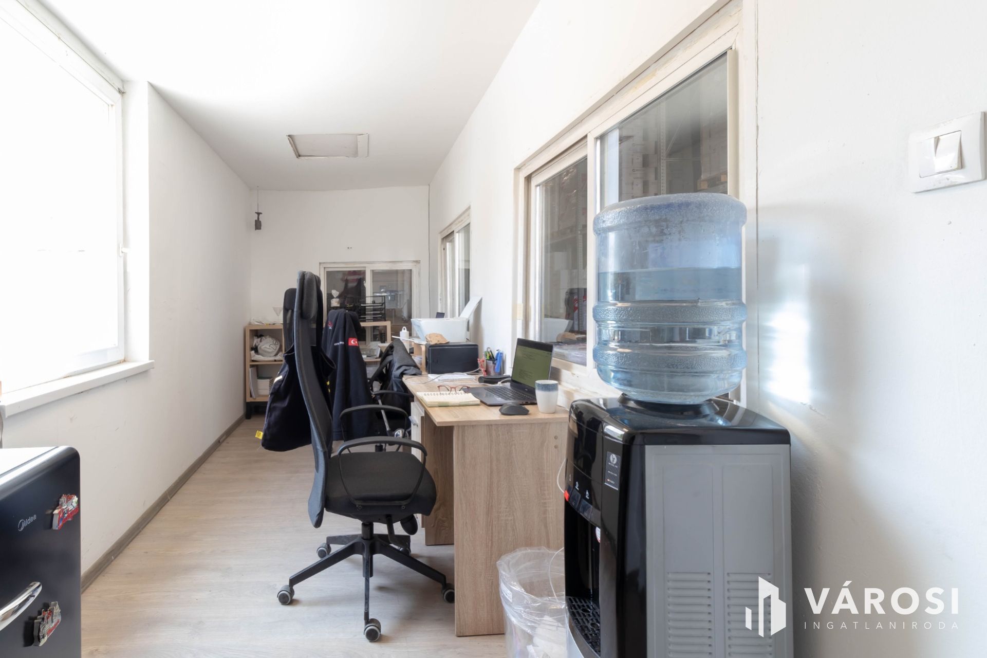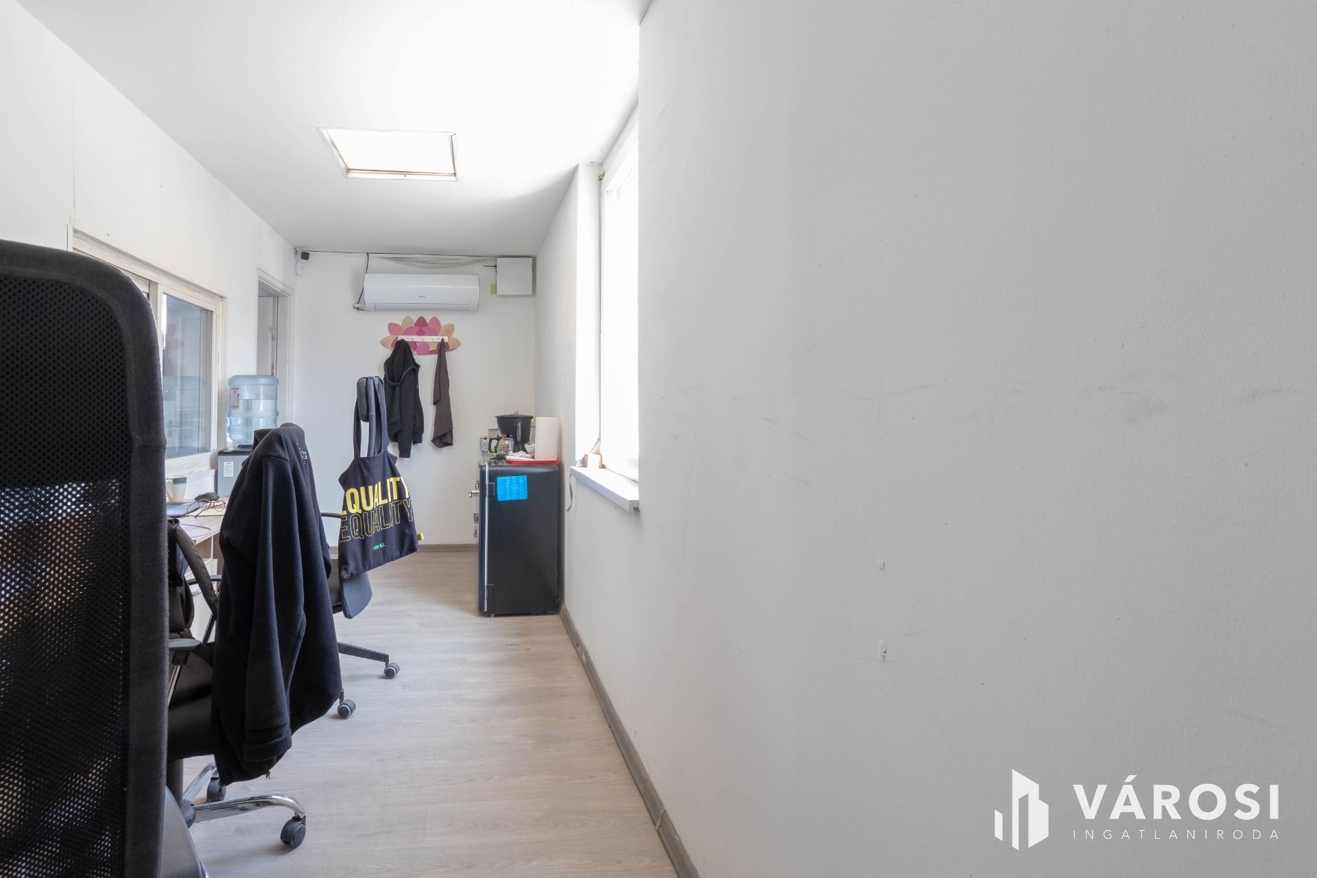 Az ingatlanhoz tartozik – az alaprajzon látható elrendezésben – egy saját, 12 m2-es, laminált padlós, klimatizált, fűthető, műanyag nyílászárókkal ellátott iroda, valamint a raktárból megközelíthető egy saját mosdó és zuhanyzó.