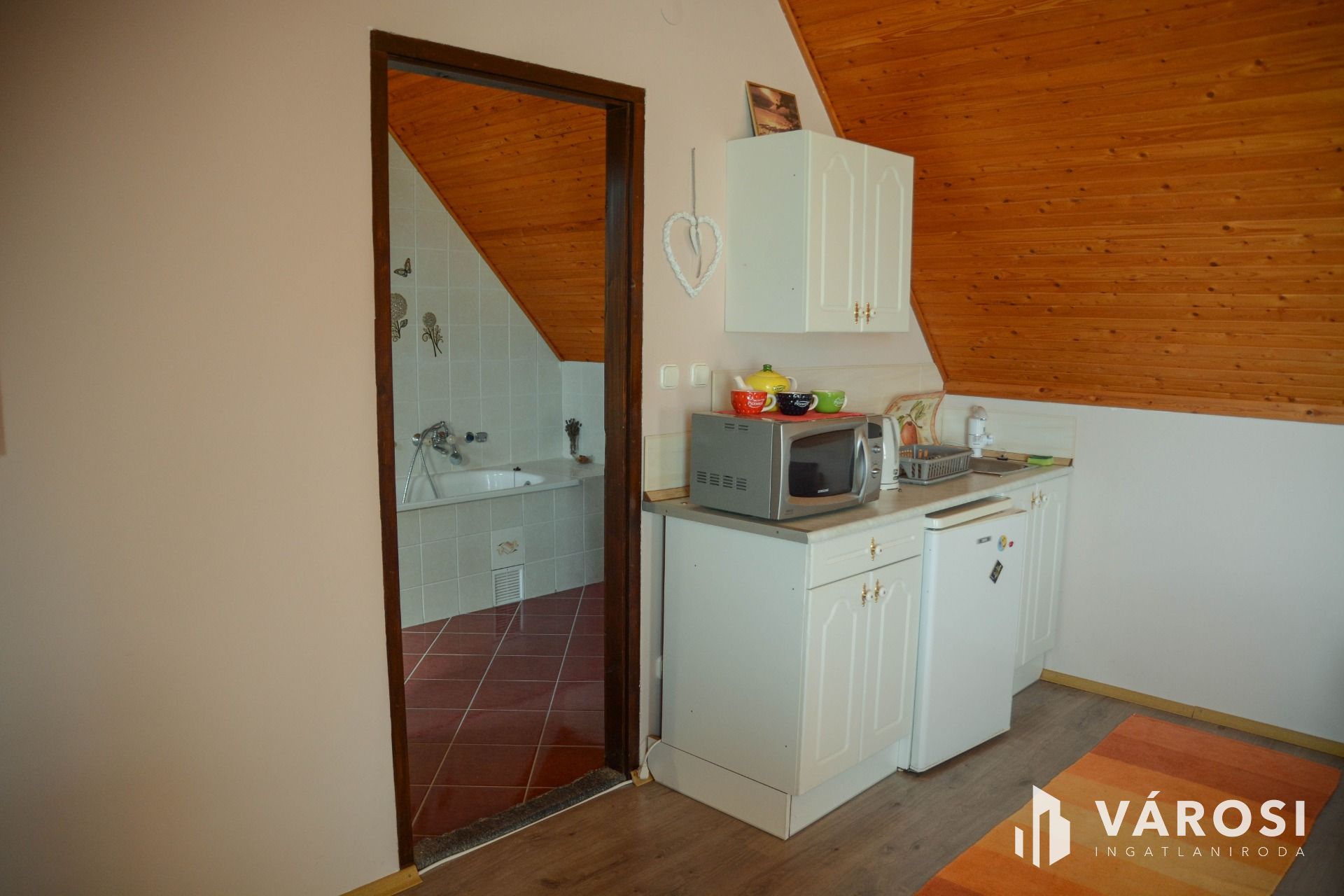On both levels, an open-plan American kitchen-living-dining room serves as the central space for family life. On the lower floor, there is also a bedroom, a bathroom with a shower, a separate toilet, and a pantry. In the upstairs apartment's bathroom, a bathtub ensures complete comfort, and from here you can already enjoy the wonderful panorama of Lake Balaton.