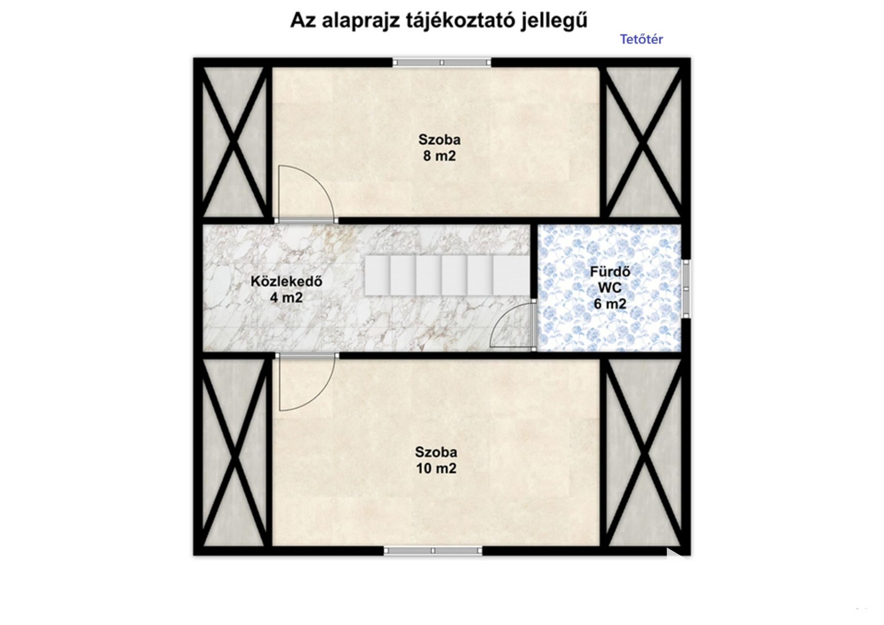 Az emeleti szinten két hálószoba található, valamint egy kisebb közlekedő, amely pihenősarokként is jól használható. Ezen a szinten kádas fürdőszoba biztosítja a komfortot, így az ingatlan duplakomfortos kialakítással rendelkezik.