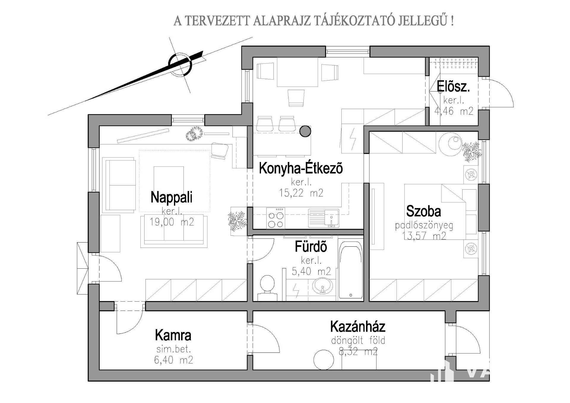 - Nappali-Konyha: ~19,00 m2