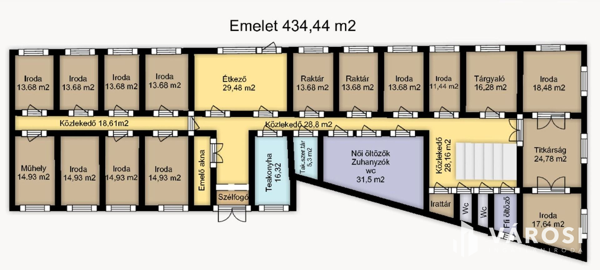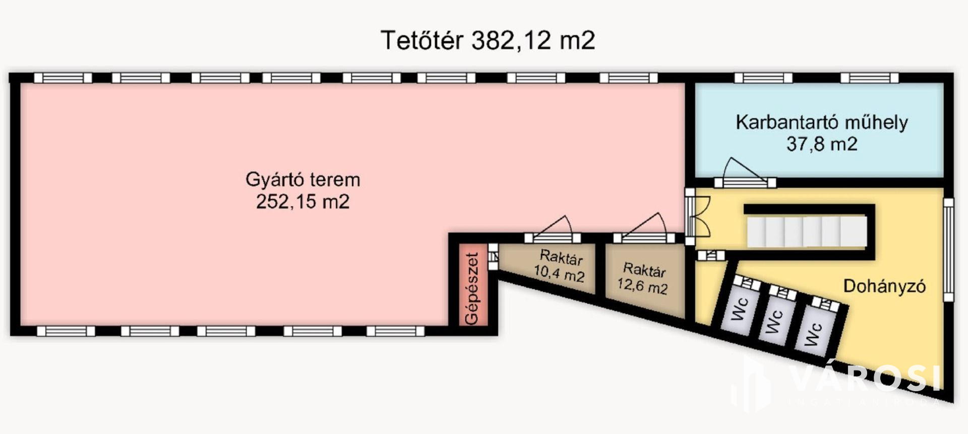 A hirdetésben a tetőtéri szint, 382 m2 lett meghirdetve, de az első emeleten lévő irodák is kiadóak.