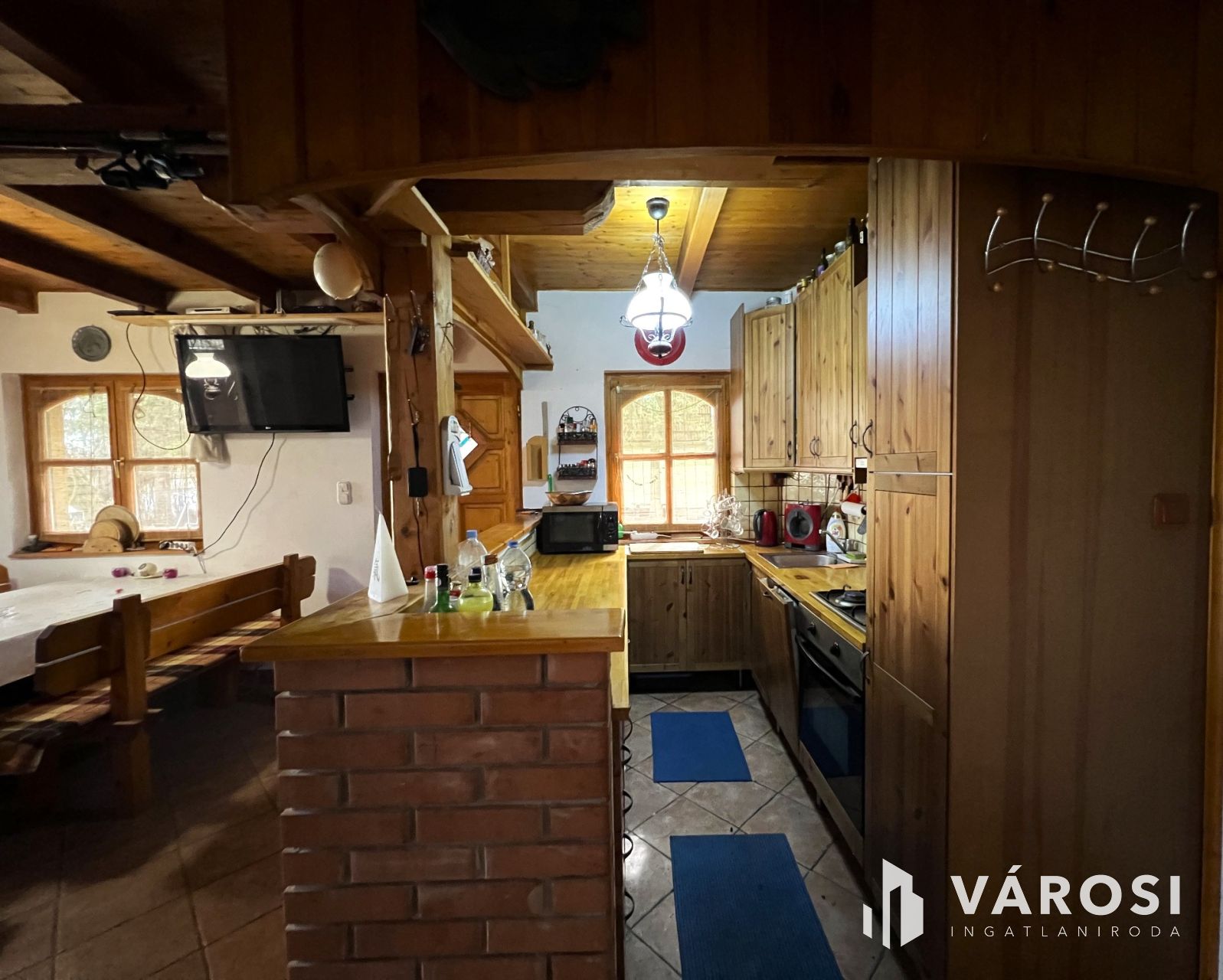 A természet közeliség megjelenik a házon belül is, sok faanyag került beépítésre, gerendázott mennyezete is az otthonosság érzetét növeli.
