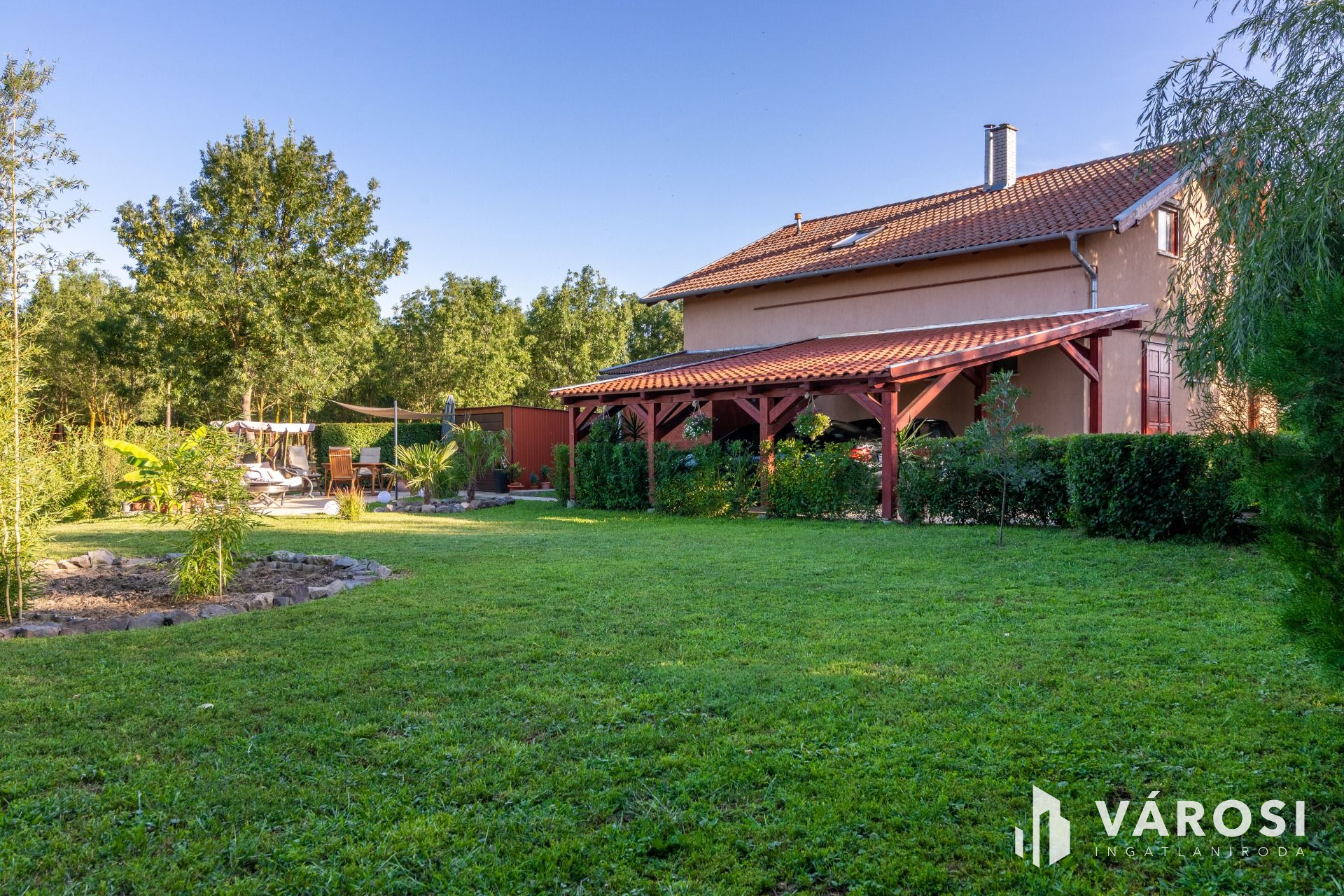 A főút menti elhelyezkedésnek köszönhetően könnyen megközelíthető, parkolási lehetőség (300 nm) biztosított. A telek mérete 1080 nm, melynek gyönyörűen parkosított udvara tökéletes a pihenésre.